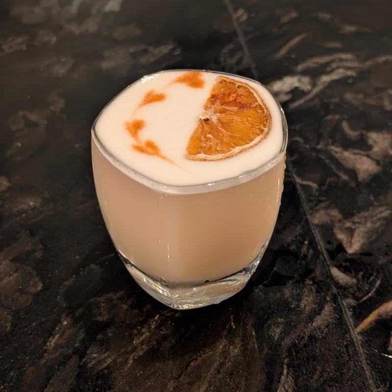 Tingala, gin, egg white, simple syrup, lemon juice, bitters, orange slice garnish