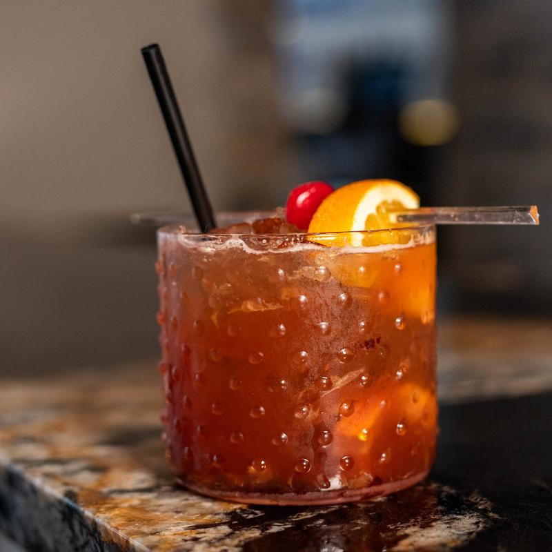 Bacon Infused Knob Creek rye whiskey, sweet vermouth, bitters, luxardo cherry garnish