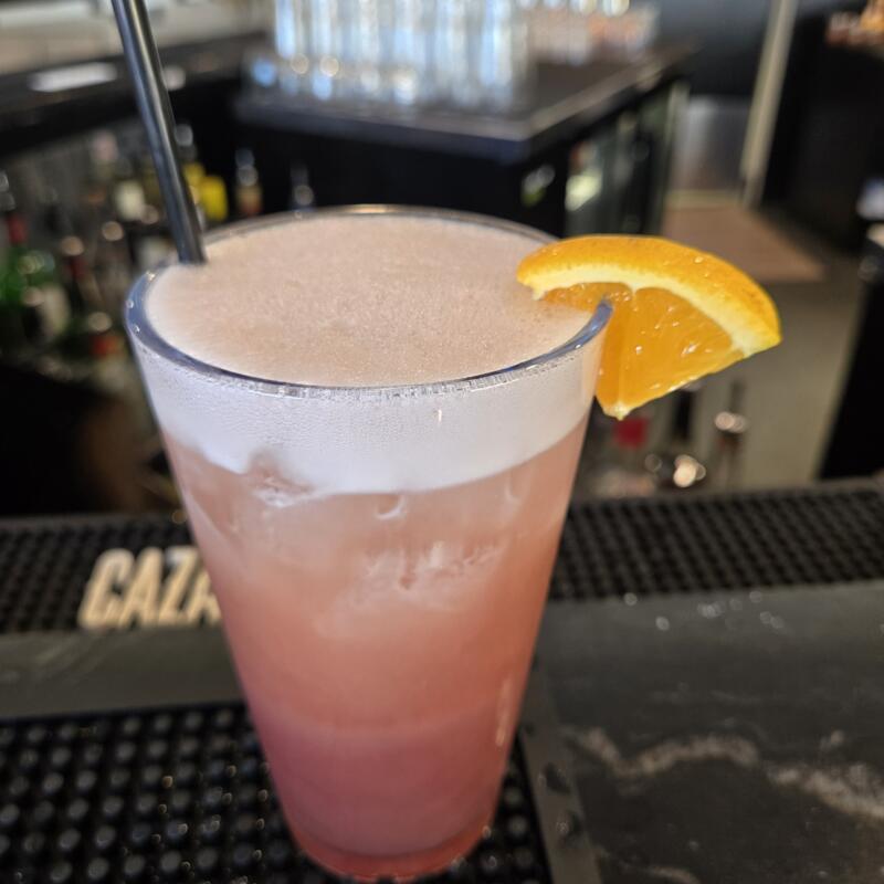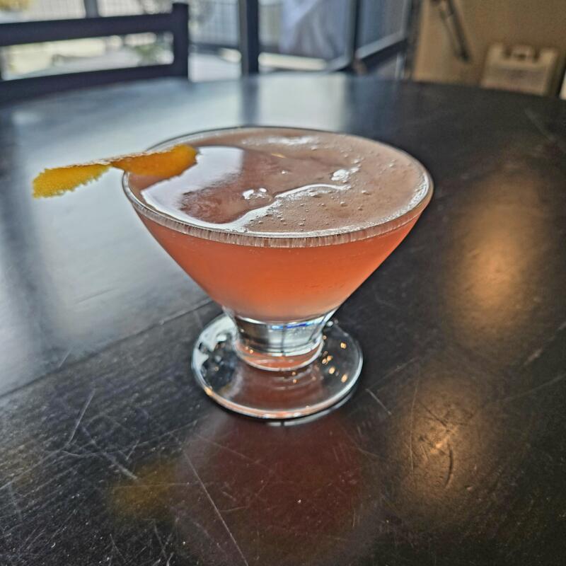 Gin, St. Germain, peach schnapps, lemonade, pomegranate juice, with a candied orange twist